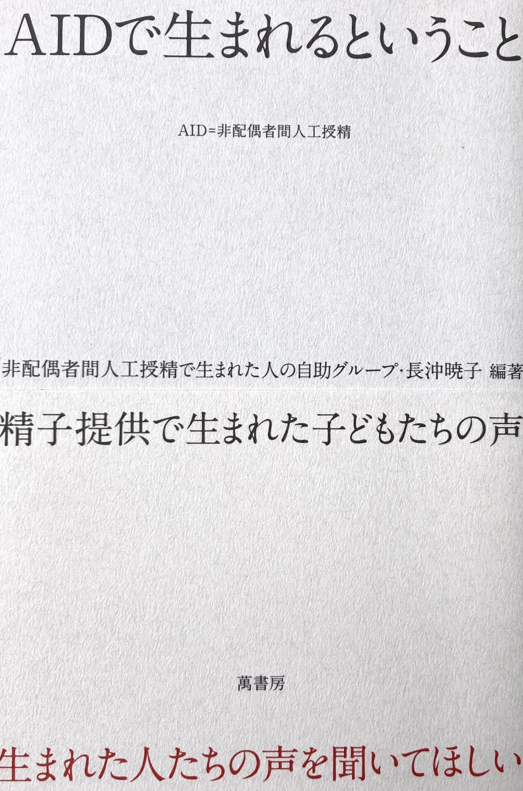 本書は非配偶者間人工授精(AIDあるいはDI。夫以外の第三者から提供された精子を用いた人工授精)で生まれた人たちが、自分たちの体験を、自分たちの言葉で綴ったものです。